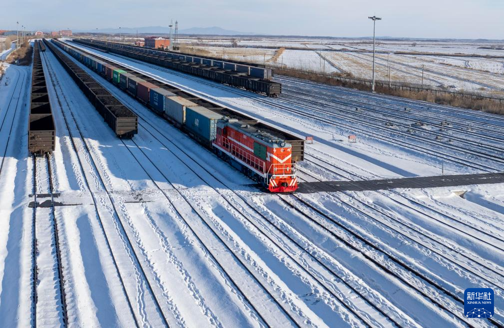 12月9日,在中国铁路哈尔滨局集团有限公司同江北站,一列中欧班列准备出发(无人机照片)。新华社发(吴雨南摄)