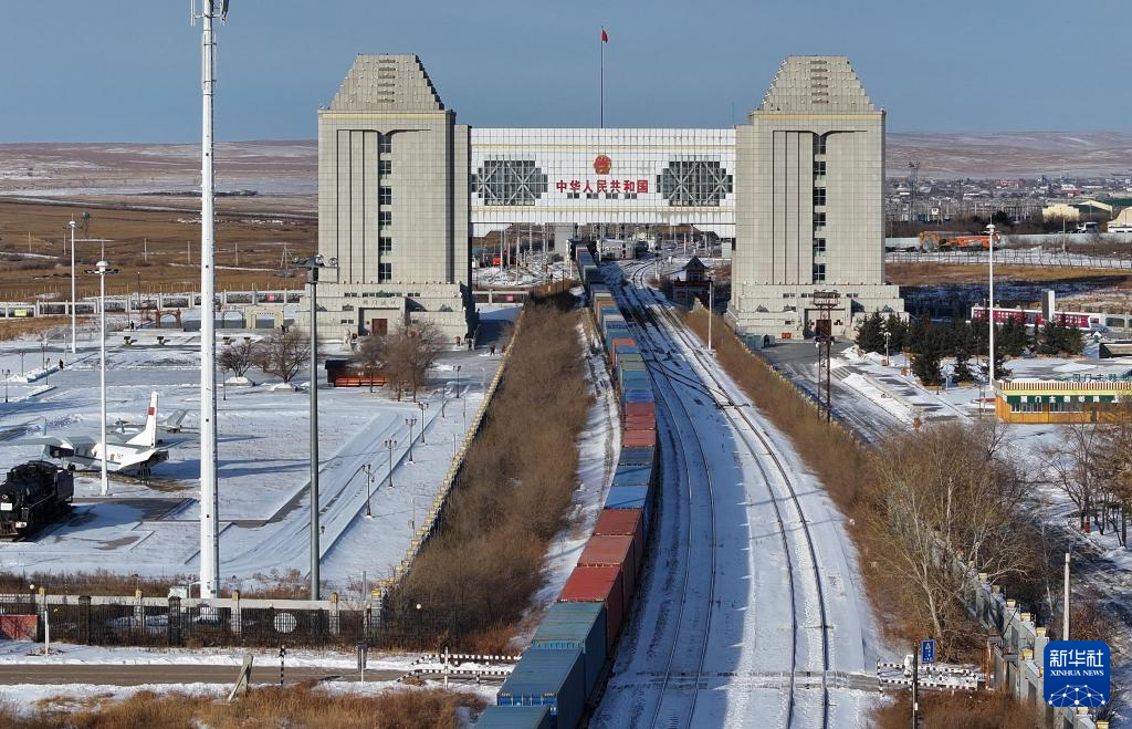 12月3日,中欧班列驶离中国铁路哈尔滨局集团有限公司满洲里站发往欧洲国家(无人机照片)。新华社发(黄旭摄)