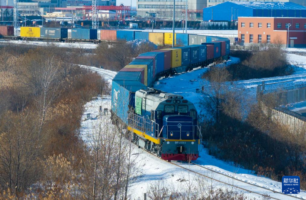 12月9日,一列中欧班列驶出中国铁路哈尔滨局集团有限公司同江北站换装场(无人机照片)。新华社发(吴雨南摄)