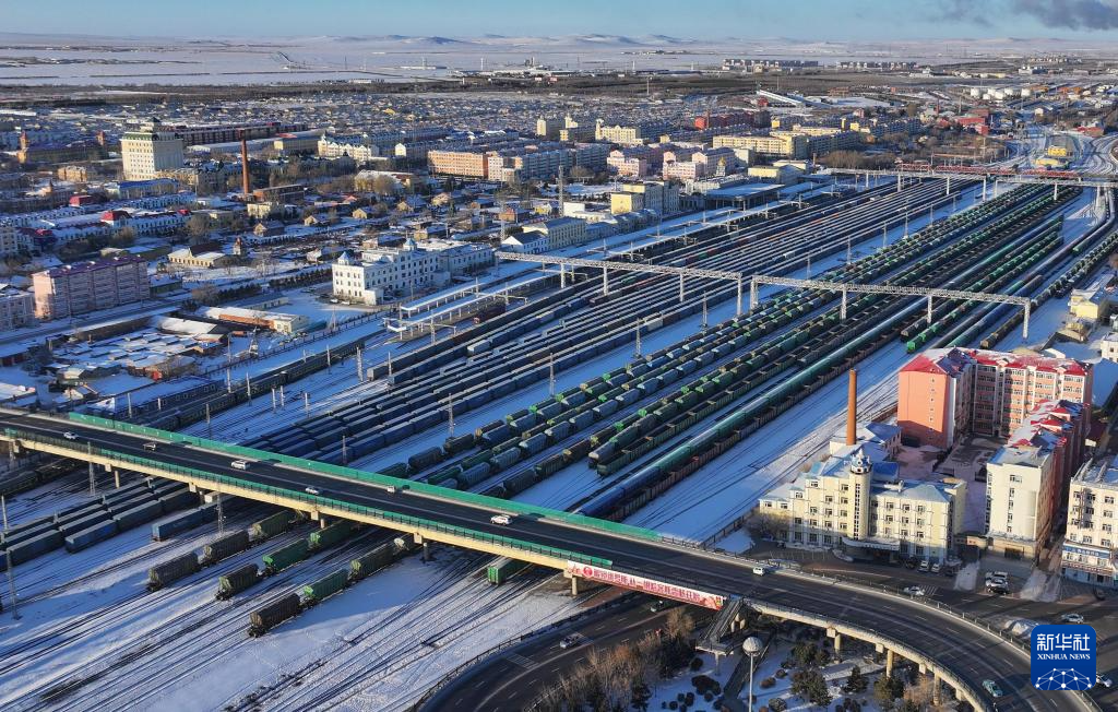 12月10日,中欧班列在中国铁路哈尔滨局集团有限公司满洲里站整装待发(无人机照片)。新华社发(黄旭摄)