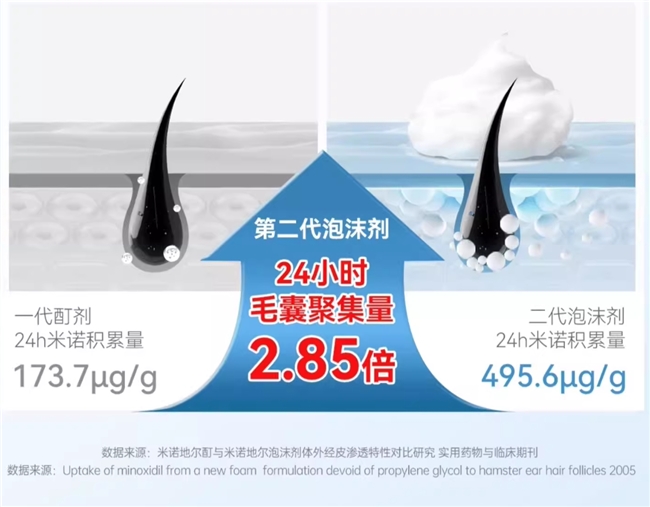 • 渗透与吸收:运用基于超饱和效应的跨细胞渗透技术,药物渗透效率显著提升。研究显示,其24小时内米诺地尔皮肤渗透量可达传统液体剂的18.9倍,毛囊蓄积量亦提高2.85倍【6】,确保活性成分充分作用于靶点。